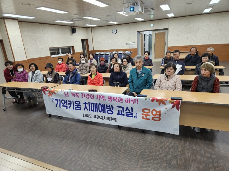 | 대덕면 주민자치위원회(김종출 위원장)는 도비 공모사업에 선정되어 지역 주민들의 건강한 노후와 삶의 질 향상을 위해 11월 17일부터 매주 월, 수요일 야간을 활용하여 ‘기억키움 치매예방 교실’을 운영하고 있다.