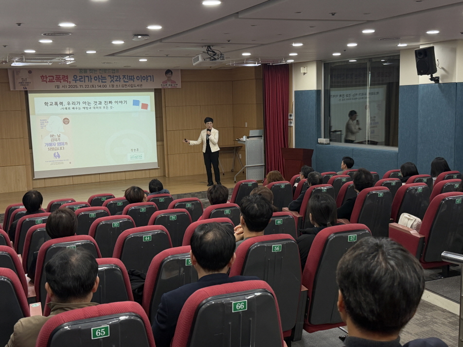 | 김천시립도서관은 지난 11월 22일 김천시민을 대상으로 학교폭력에 대한 이해와 대응을 주제로 한 강연 ‘학교폭력, 우리가 아는 것과 진짜 이야기’를 성공적으로 마무리했다고 밝혔다.