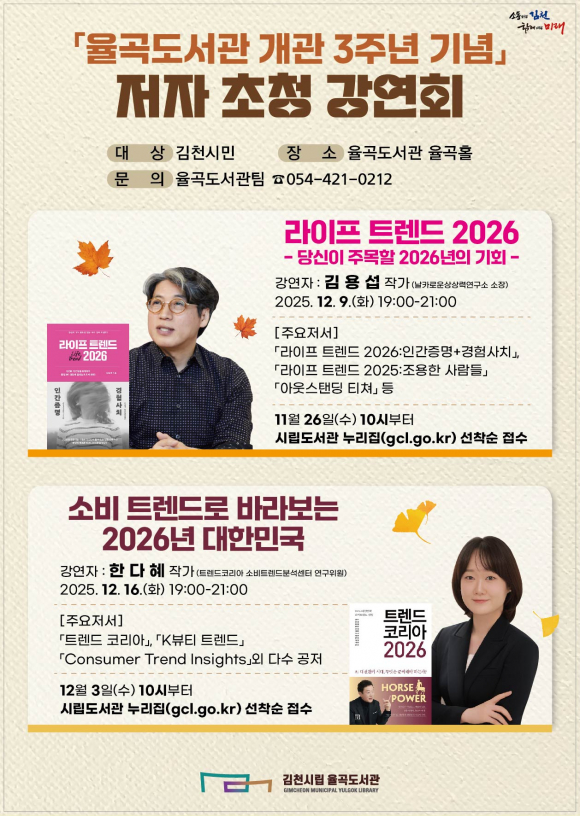 | 김천시립 율곡도서관은 개관 3주년을 맞아 오는 12월 국내 대표 트렌드 전문가를 초청해 강연회를 개최하고, 참가자를 모집한다. 이번 강연회는 빠르게 변화하는 시대 속에서 시민들이 미래의 라이프스타일과 트렌드를 이해할 수 있도록 마련된 프로그램이다.