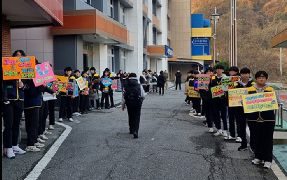 | 성의중학교(교장 신재을)는 11월 26일 오전 8시 본교 교정 앞에서 [2025 하반기 마음건강 특별 살핌주간]을 맞아 자살예방 및 생명존중교육에 앞서 아침 등굣길 맞아주기 행사를 실시하였다. 학생회 임원 및 또래상담반의 협조를 받아 실시된 이번 행사에서 전교직원 또한 등굣길 학생들의 즐거운 분위기 조성에 앞장서서 아침 등굣길 학생들을 맞이하였다. 본 행사로 인하여 즐거운 음악과 웃음이 학생들을 웃는 하루로 만들어 줄 수 있어서 기쁨이 두 배가 되었다.