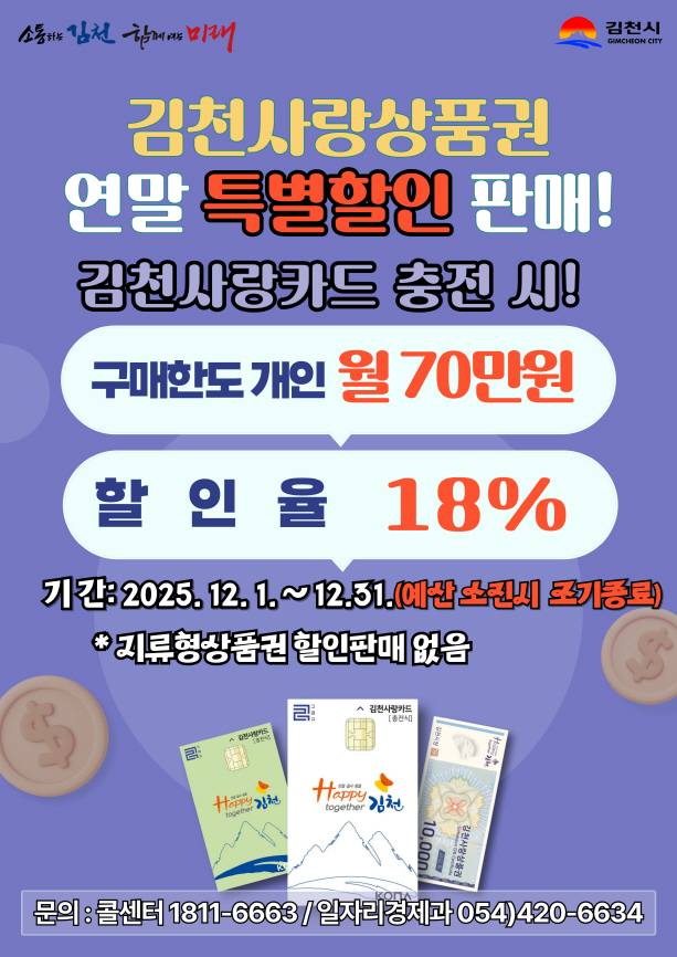김천시 관계자는 “연말을 맞아 진행하는 김천사랑상품권 특별 할인판매가 상권 활성화와 지역경제에 실질적인 보탬이 되기를 바라며, 많은 시민이 혜택을 누리고, 조금 더 따뜻한 연말을 보내는 데 도움이 되었으면 한다.”라고 말했다. |
