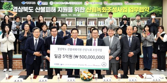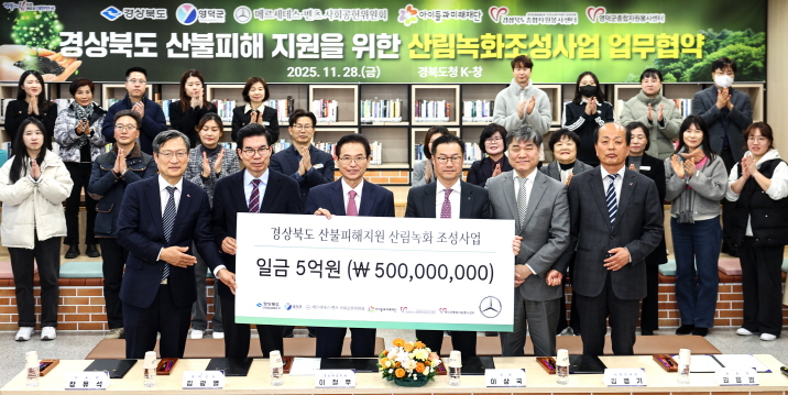 |  | | | ⓒ 김천내일신문 | | 경상북도는 11월28일 경북도청 K창에서 영덕군, 메르세데스-벤츠 사회공헌위원회, 아이들과미래재단, 경상북도종합자원봉사센터, 영덕군종합자원봉사센터와 ‘경상북도 산불피해지원을 위한 산림녹화조성사업 업무협약’을 체결하고 기부금 전달식을 개최했다.