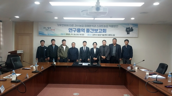 | 김천시(시장 배낙호)는 지난 11월 26일, 기후변화에 따른 과수 농업 피해 분석과 스마트농업 적용 방안 연구용역 중간 보고회를 개최했다.