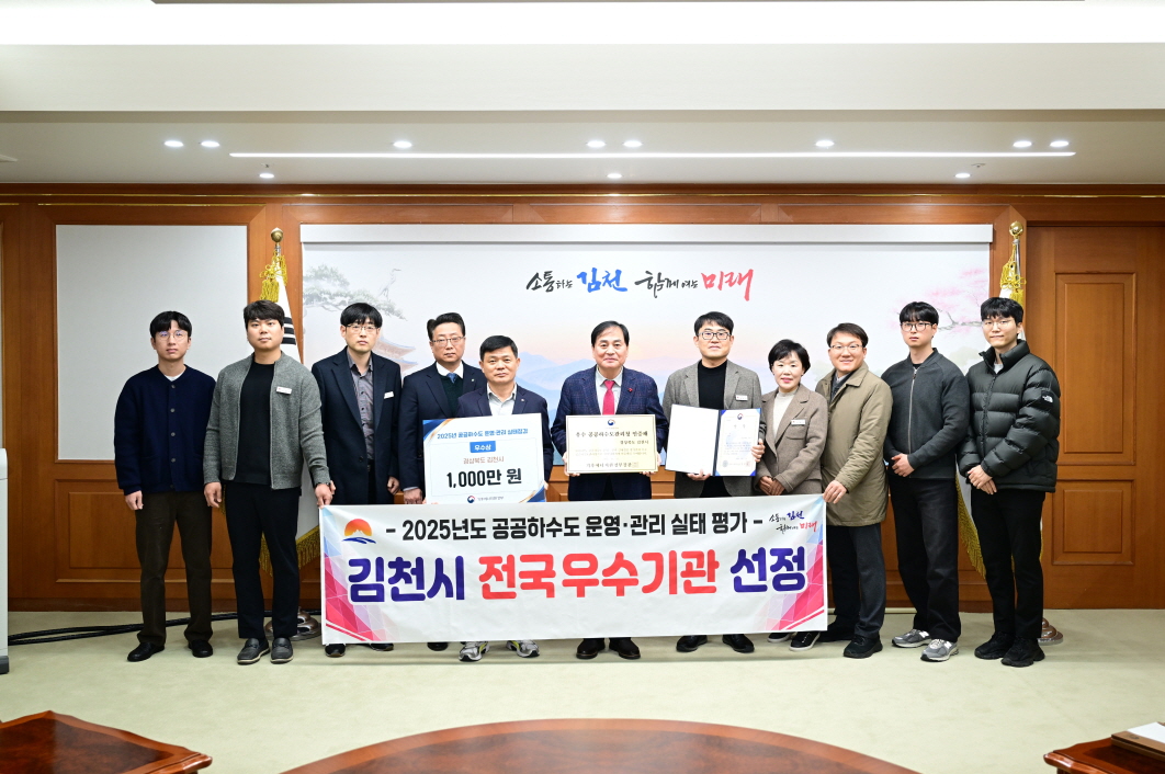 | 김천시는 11월 27일, 하수도 연찬회 시상식에서 기후에너지환경부가 주관하는 ‘2025년도 전국 공공하수도 운영 ㆍ 관리 실태 평가’에서 우수기관으로 선정되어 인증패와 포상금 천만 원을 수여받았다고 밝혔다.