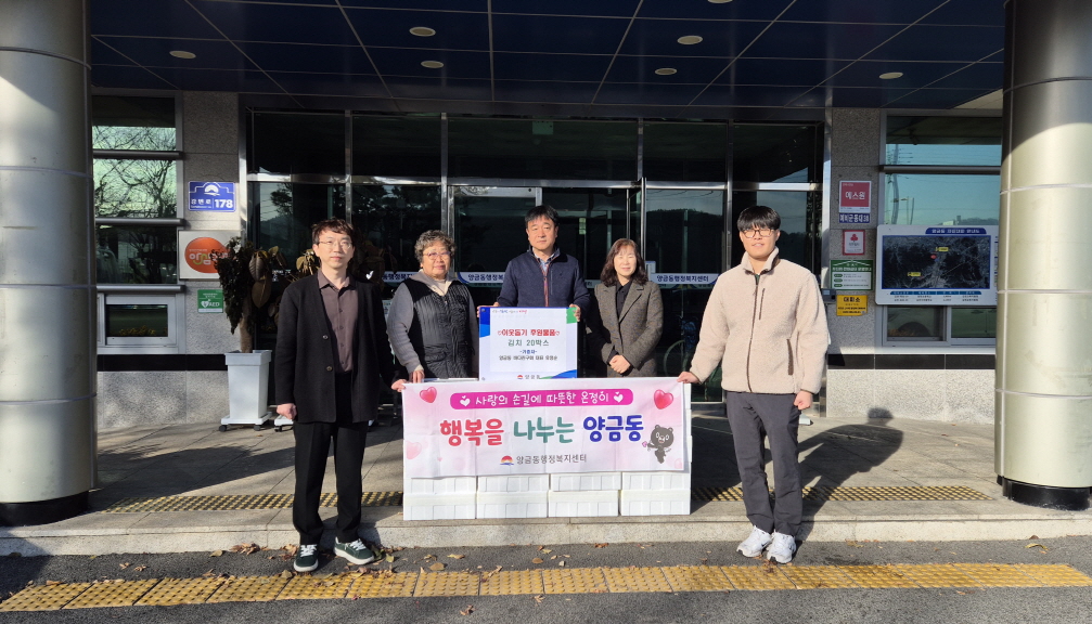 이어 강성규 양금동장은 “지역 상인들께서 자발적으로 나눔에 동참해 주셔서 큰 힘이 되고 있다.”라며 “전달된 물품은 도움이 필요한 가정에 신속하게 배부하겠다.”라고 감사의 뜻을 전했다.