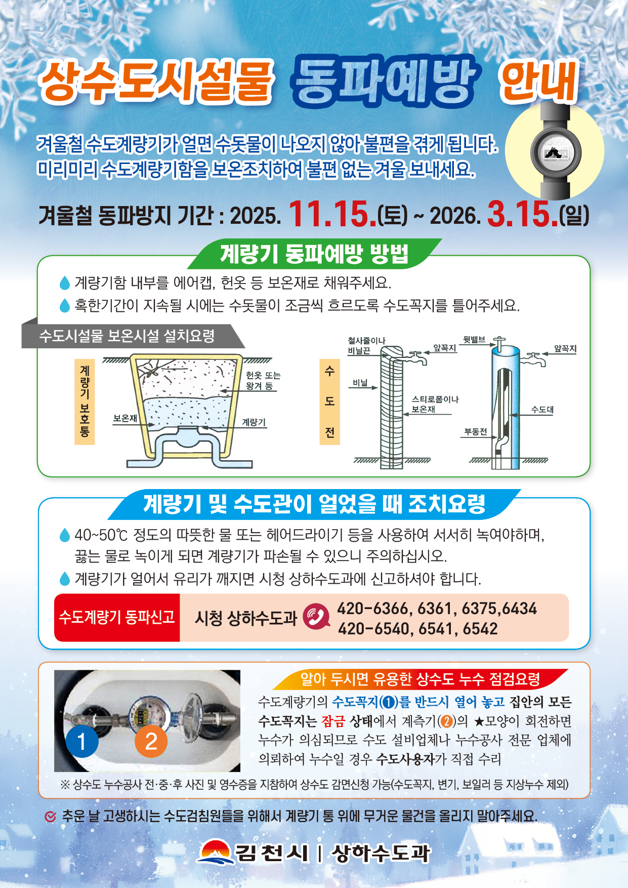 | 김천시는 2025년 11월 15일부터 2026년 3월 15일까지 동절기 기간동안 수도계량기 동파를 미리 예방할 수 있도록 겨울철 동파 대책을 추진한다고 밝혔다. 우선, 수도계량기 동파 방지를 위해 노후주택이나 상가 등 동파 취약지역을 대상으로 동파 보온재 500개를 공급하고, 가정에서 쉽게 따라 할 수 있는 동파 예방법 및 조치 요령을 안내한 홍보문을 배부할 예정이며, 동파 예방 대책반을 운영하여 동파 발생을 최소화할 계획이다. 수용가에서는 겨울철 수도계량기 동파 예방을 위해 스티로폼이나 헌 옷 등으로 수도계량기를 보온해 주고 계량기 보호통 내에 외부 공기가 유입되지 않도록 뚜껑 부분을 보온재로 밀폐해 주는 것이 동파 예방에 도움이 된다. 특히 한파 시에는 기상예보에 따라 보온 상태를 주기적으로 확인하는 조치가 필요하다.