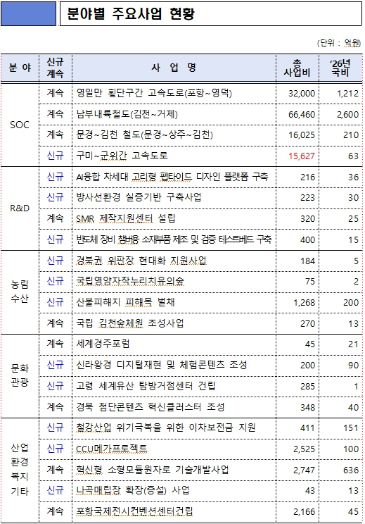 지역의 균형발전과 효율적 성장을 견인할 SOC 분야에는 ▲영일만 횡단구간 고속도록(포항~영덕) 1,212억원 ▲ 남부내륙철도(김천~거제) 2,600억원 ▲ 문경~김천 철도(문경~상주~김천) 210억원과 최근 예타 통과된 총사업비 1조 5,627억원의 ▲ 구미~군위간 고속도로 63억원, 총사업비 2,525억원의 CCU 메가프로젝트 100억원 등 신규 사업이 반영되어 경북의 미래 성장 기반 마련에 중요한 역할을 했다.