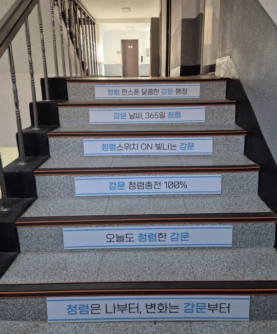 | 김천시 감문면 행정복지센터(면장 이재수)에서는 반부패, 청렴도 향상을 위해 청사 내 청렴 계단을 조성했다.