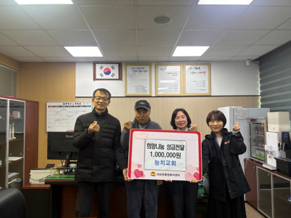 | 어모면 능치교회(담임목사 박배형)는 지난 12월 3일 어모면 행정복지센터를 방문하여 저소득층 및 복지 사각지대 가구 지원을 위한 성금 100만 원을 기탁했다.