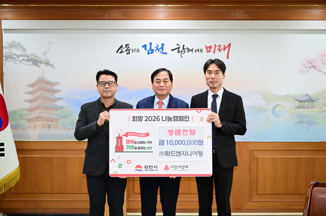 | 김천시(시장 배낙호)은 지난 12월 5일, ㈜위드엔지니어링(대표 임은호)으로부터 희망2026나눔캠페인 성금 1,000만 원을 전달받았다고 밝혔다.