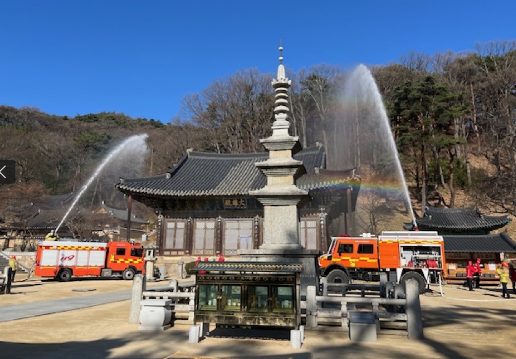 훈련은 화재에 취약한 목조 문화유산 방어 및 산불 확산 초기 대응에 초점을 맞췄으며, 화재신고 ▶ 관계인 소방시설 활용 초기대응 ▶ 현장 출동 ▶ 문화재 반출 ▶ 환자이송 및 화재진압 등 실전과 같은 절차로 실시했다.