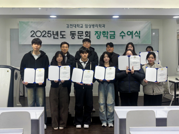| 김천대학교(총장 윤옥현) 임상병리학과는 지난 12월 9일 학과 강의실에서 졸업생 동문회인 '청솔 동문회'에서 조성한 장학금 수여식을 개최했다고 밝혔다. 이번 수여식에서는 학업 성적이 우수하고 모범적인 학생 7명에게 장학금이 전달되었다.