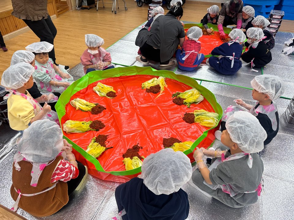 이번 김장체험은 유아들이 겨울을 준비하는 우리 고유의 전통문화를 직접 경험하며 김치가 만들어지는 과정을 알 수 있도록 실시하였다. 유아들은 사전에 겨울철 저장음식에 대해 이야기를 나누고, 김치를 담그는 방법에 대해 알아보았다. 이후 요리 활동 시 지켜야 할 약속을 지켜 김장체험에 참여하였다. 유아들은 먼저 재료를 탐색하고 절인 배추에 양념을 버무리며 김치를 담갔다. 담근 김치를 통에 담고 사진을 찍으며 뿌듯해했다. 체험에 참여한 잎새반 유아 OOO는 “빨간 양념이 묻어서 조금 매울 것 같은데 먹어보고 싶어요”, “김장은 힘들지만 재미있어요.”라고 소감을 말했다.