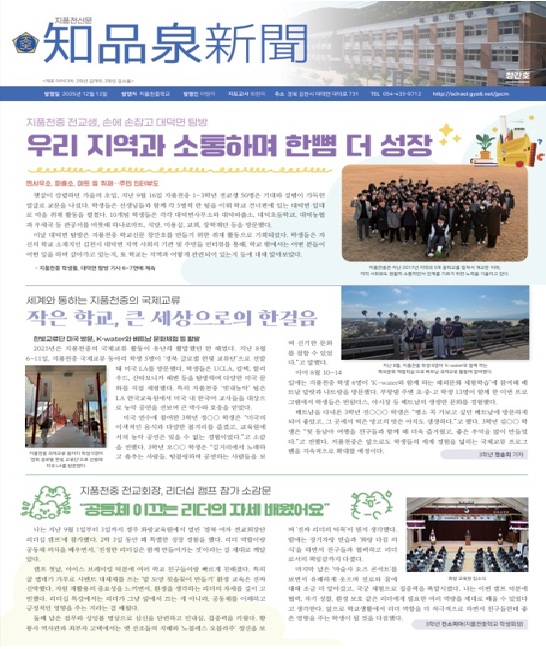 | 지품천중학교(교장 이명자)는 12월 12일, 학생들이 직접 기획·취재·편집한 학교신문 『지품천신문』 창간호를 발행하고 전교생과 학부모, 지역사회에 배부하였다.