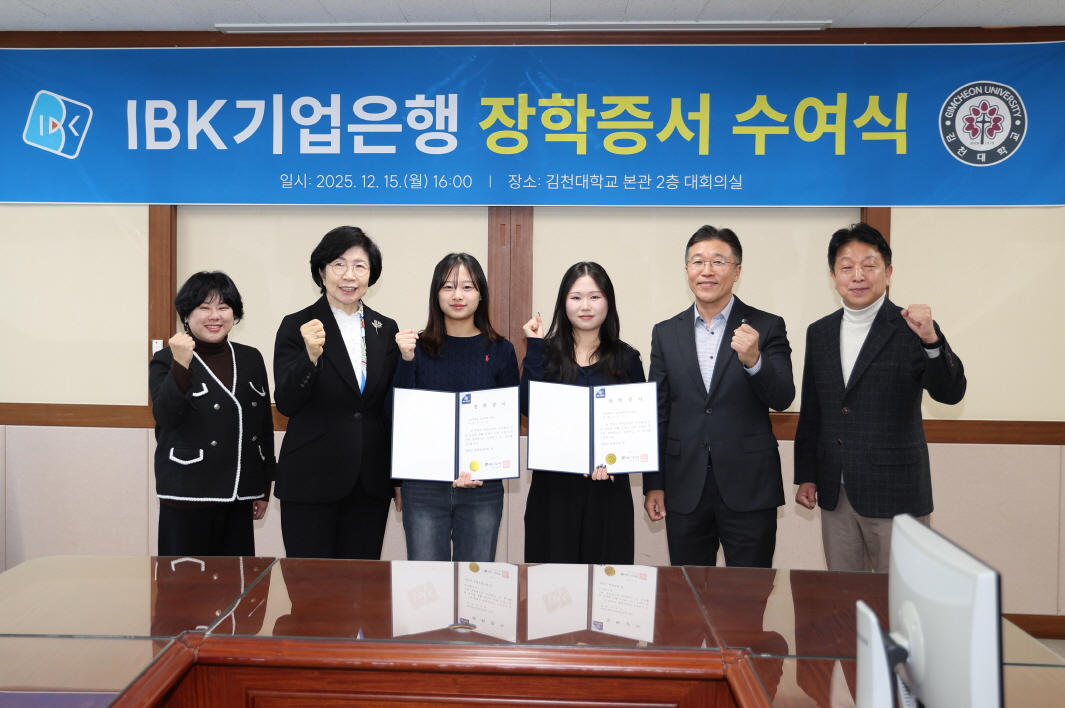 | 김천대학교(총장 윤옥현)에서는 12월 15일 김천대학교 대회의실에서 IBK기업은행(김천지점장 정재원)이 지원하는 2025학년도 장학증서 수여식을 개최하고, 장학금을 수여했다.