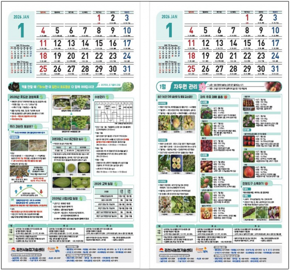 이번에 제작된 재배 매뉴얼 달력은 샤인머스켓 5,500부, 자두 3,500부로, 김천시에 주소를 두고 농업경영체로 등록된 포도·자두 재배 농가를 대상으로 배부된다. 달력은 농업인이 영농 현장에서 시기별로 필요한 정보를 손쉽게 확인할 수 있도록 실용성과 가독성을 높인 벽걸이형으로 제작되었다.