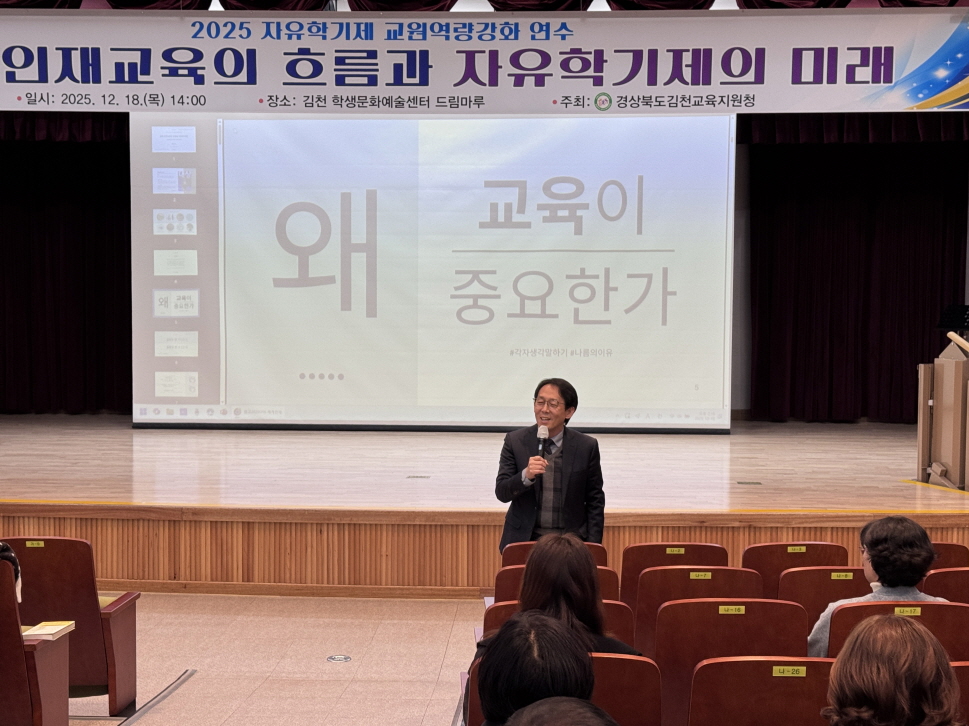 | 경상북도김천교육지원청(교육장 모태화)은 12월 18일 김천학생문화예술센터 드림마루에서 관내 초‧중‧고 교원 120여명을 대상으로 「2025 자유학기제 교원역량강화 연수」를 개최하였다. 이번 연수는 급변하는 글로벌 교육환경 속에서 교원의 전문성을 강화하고, 학생 역량 중심의 미래형 자유학기제 운영 기반을 마련하기 위해 추진되었다.