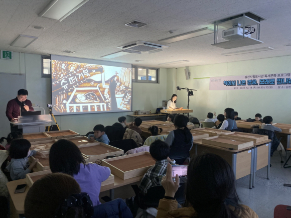 | 김천시립도서관(관장 이신기)은 지난 12월 18일 문화 향유 접근성이 낮은 장애 아동을 대상으로 독서 문화 공연 「책에서 나온 영웅, 모래로 만나는 슈퍼거북」을 성황리에 운영했다고 밝혔다.