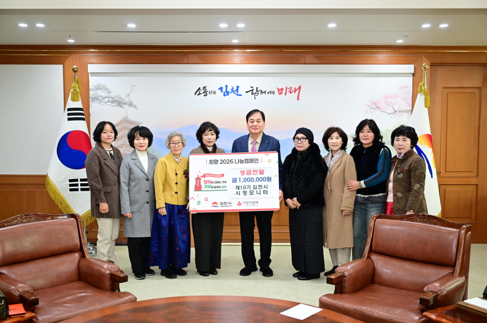 배낙호 김천시장은 “시정 발전을 위해 현장에서 시민의 목소리를 전해주시는 시정모니터 여러분의 노고에 깊이 감사드린다.”라며, “기탁해 주신 성금은 어려운 이웃들에게 소중히 전달될 수 있도록 하겠다.”라고 말했다.