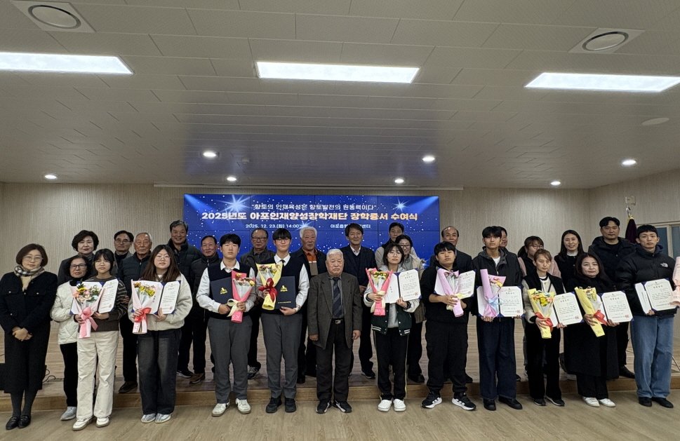 | 김천시 아포인재양성장학재단(이사장 강타관)은 지난 12월 23일 아포읍 행정복지센터 강당에서 아포인재양성장학재단 강타관 이사장, 이서정 아포읍장, 성기호 아포농협조합장 등 40여 명이 참석한 가운데 2025년 장학증서 수여식을 개최했다.