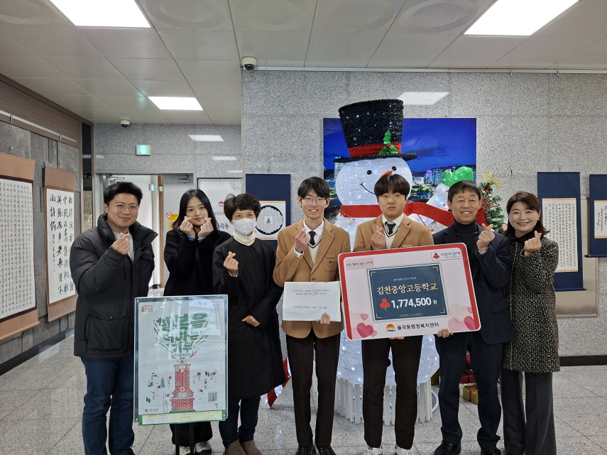 | 김천중앙고등학교(교장 김종현)는 12월 23일 율곡동 행정복지센터를 찾아 사회복지공동모금회가 주관하는 「희망 2026 나눔 캠페인」에 성금을 기탁했다.