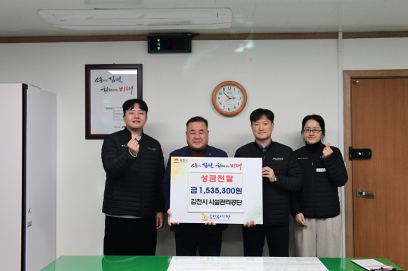 | 김천복지재단(이사장 배낙호)은 지난 12월 26일, 김천시 시설관리공단(이사장 김재광)으로부터 성금 1,535,300원을 전달받았다고 밝혔다.