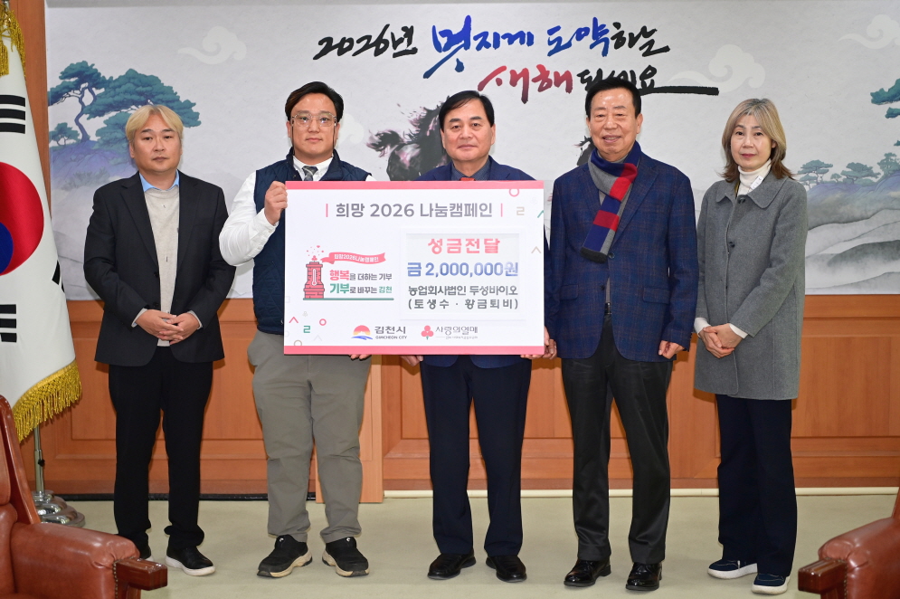 배낙호 김천시장은 “어려운 경제 여건 속에서도 따뜻한 나눔을 실천해 주신 농업회사법인 두성바이오에 깊이 감사드린다.”라며 “기탁해 주신 성금은 도움이 절실한 이웃들에게 소중히 전달하겠다.”라고 전했다. |
