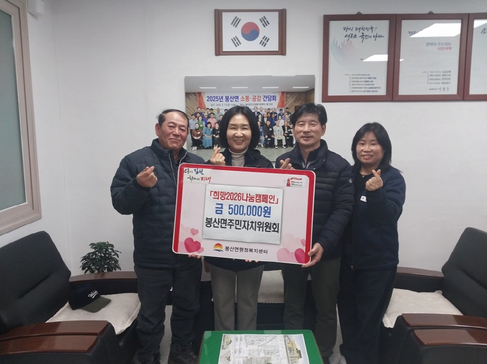 조세현 봉산면 주민자치위원장은 “연말을 맞아 주변의 어려운 이웃들에게 따뜻한 온기를 전하고자 성금을 마련했다.”라며 “앞으로도 지역사회를 위한 나눔과 봉사에 앞장서겠다.”라고 소감을 밝혔다. 이진숙 봉산면장은 “기부해 주신 따뜻한 마음과 관심에 깊이 감사드린다. 힘써주신 나눔은 복지 사각지대를 해소하는 데 큰 도움이 될 것이며, 펑소에 주민자치위원회가 주민의 목소리를 행정에 반영할 수 있도록 소통과 협력에 앞장서 주셨듯이, 앞으로도 지역 발전을 위해 지속적인 관심과 협조를 부탁드린다.”라고 전했다.