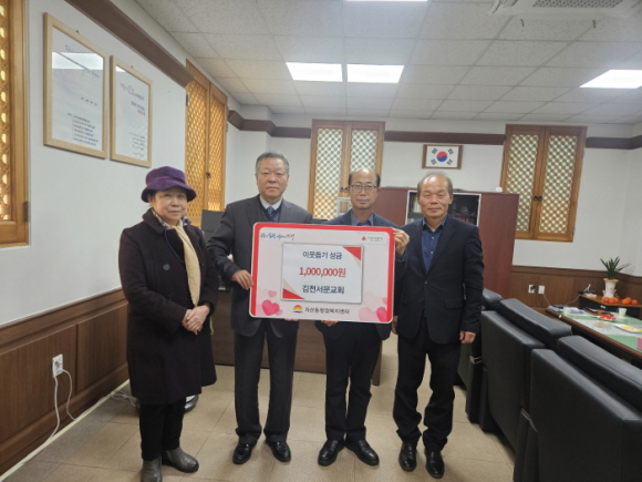 |  | | | ⓒ 김천내일신문 | | 김천서문교회(담임목사 김성수)는 지난 12월 30일 자산동 행정복지센터를 방문해 지역의 어려운 이웃을 돕기 위한 ‘희망2026 나눔캠페인’성금 100만 원을 전달했다.