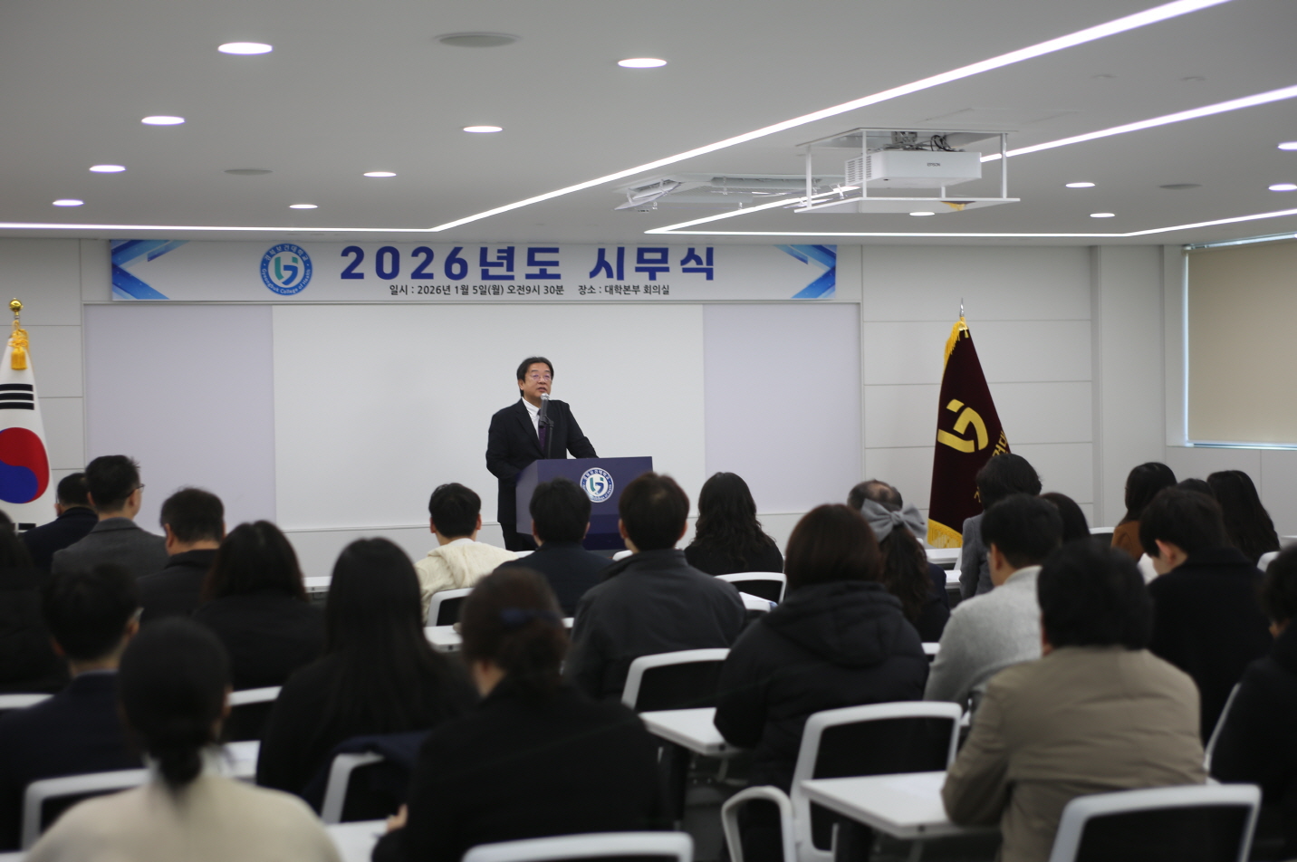 이날 시무식은 △개회 △국민의례 △총장 신년사 △표창장 및 상패 전수 △공로상 시상 △신임 교직원 소개 △교직원 상호 간 단체 신년인사 △신년구호 제창 △폐회 순으로 진행됐으며, 교직원들이 한자리에 모여 새해 인사를 나누는 차분하고 의미 있는 행사로 마련됐다.