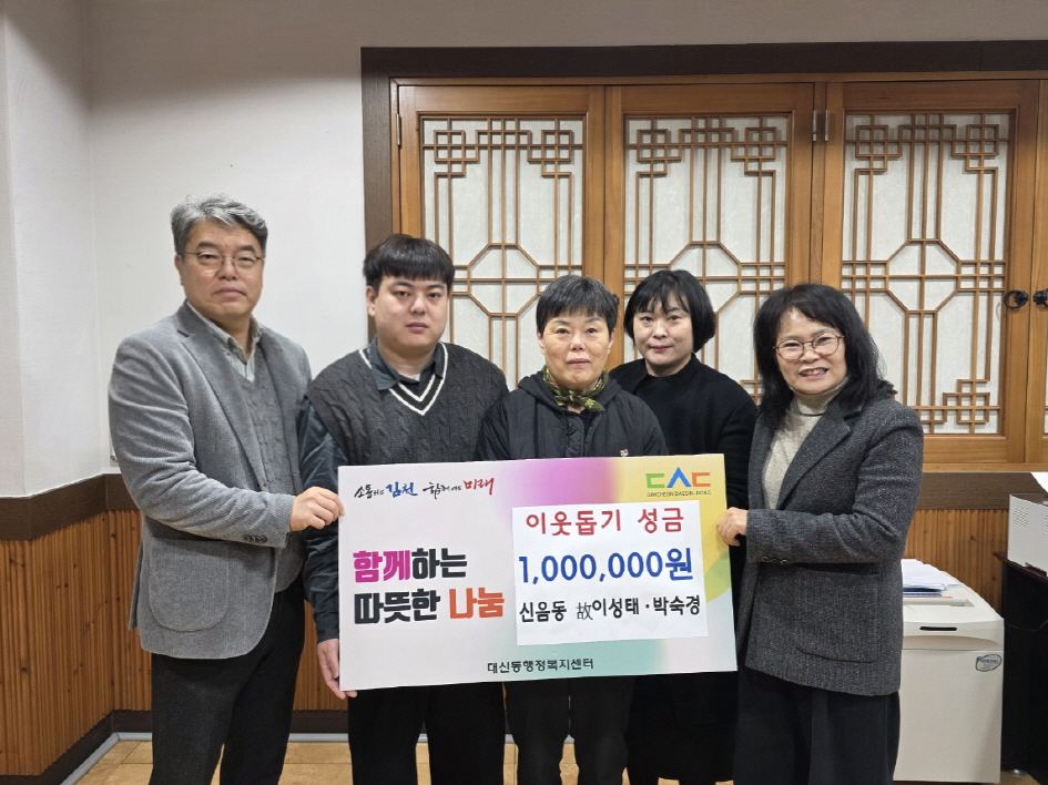 | 김천시 신음동에 거주하는 박숙경 씨는 지난 1월 7일, 대신동 행정복지센터에 방문하여 생전에 일상에서 나눔을 실천했던 남편 고(故) 이성태 씨의 뜻을 이어 지역의 어려운 이웃을 위해 사용해달라며 김천복지재단에 성금 100만 원을 기부했다.