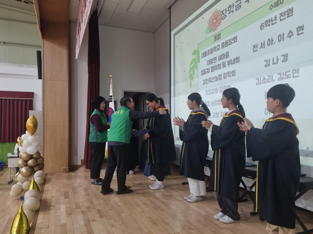 | 김천시 대항면 새마을협의회(회장 이루환, 부녀회장 유남순)는 1월 7일 대룡초등학교 졸업식에서 졸업생을 대상으로 장학금 20만 원을 전달하며 지역 인재 양성을 응원했다.