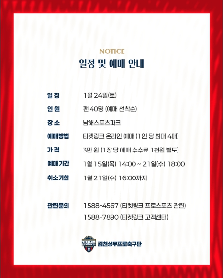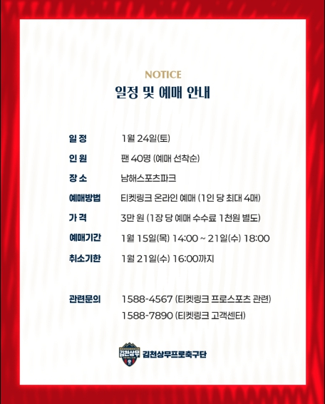 한편, 김천상무는 2월 28일 포항스틸러스, 3월 8일 전북현대를 홈으로 불러들여 홈 개막 2연전으로 2026시즌을 시작한다.