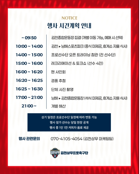 김천상무 이재하 대표이사는 “언제나 변함없이 응원을 보내주는 팬 여러분과 소통하고자 팬즈데이를 준비했다.”라며 “새 시즌을 함께 준비하는 의미 있는 시간이 되길 바란다.”라고 말했다.