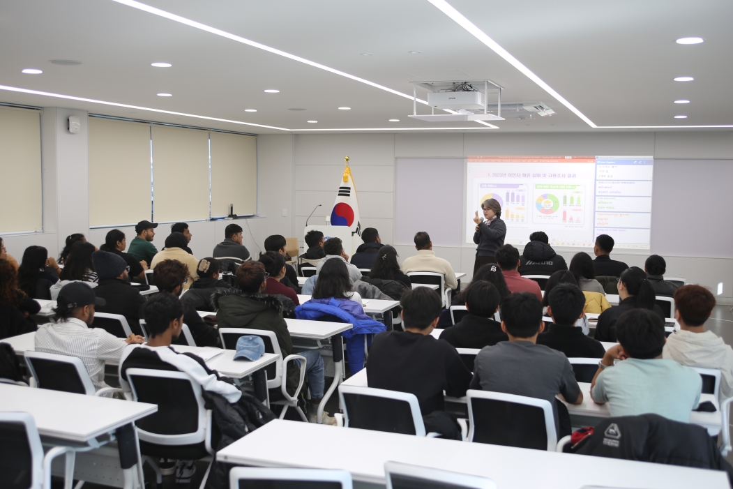 이번 프로그램에서는 K-드림외국인지원센터 장흔성 센터장이 ‘경상북도 외국인 정책과 지역특화비자 및 취업 연계 방안’이라는 주제로 강연을 진행했다. 장흔성 센터장은 경상북도 외국인 정책 기본계획을 비롯해 K-드림외국인지원센터의 역할, 경상북도 지역특화비자 제도(F-2R, F-4R, E-7-4R), 외국인을 위한 주요 사회서비스 등을 소개했다. 이를 통해 외국인 유학생들은 향후 비자 설계와 졸업 이후 진로, 지역 정착 방안에 대해 보다 구체적인 정보를 얻는 시간을 가졌다.
