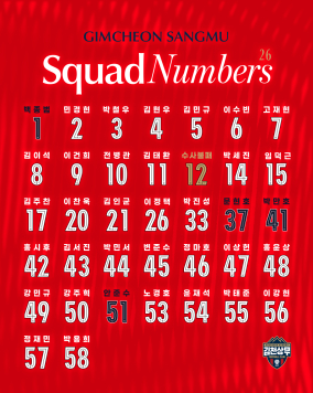 | 김천상무프로축구단(대표이사 이재하)이 1월 20일, 2026시즌 K리그에 참가하는 선수단의 배번을 공개했다. 올 시즌 배번에는 많은 변화가 있다. 맏형 박철우는 왼쪽 풀백의 상징인 3번을 선택했다. 7번의 계보는 고재현이 이어간다.