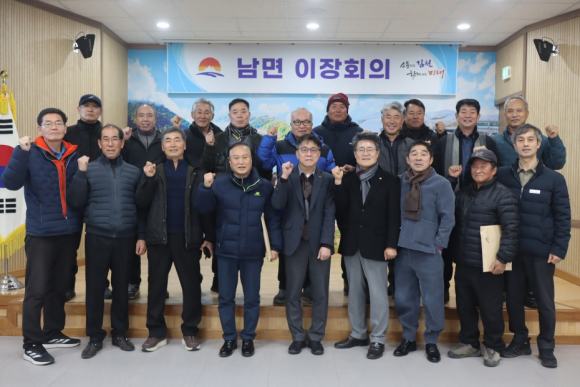 이번 회의는 2026년 1월 1일자로 남면장으로 부임한 정명수 면장 및 전입·전보한 직원들의 인사를 시작으로 당면 현안 사항 전달 및 이장협의회 자체 회의 순으로 진행됐다. 또한, 이날 회의에서는 신임 이장협의회장 및 임원진 구성이 완료되어, 2026년 남면 이장협의회를 이끌어갈 새로운 지도부가 출범했다. 선출된 임원진은 앞으로 주민과 행정을 잇는 가교 역할을 수행하며 이장 간 협력과 소통을 강화하고, 주민 화합과 지역 발전에 앞장설 예정이다.