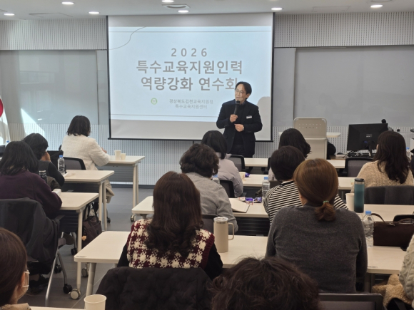 | 김천교육지원청(교육장 모태화)은 1월 26일, 관내 특수교육실무사 및 사회복무요원을 대상으로 「2026 특수교육지원인력 역량강화 연수」를 실시하였다.