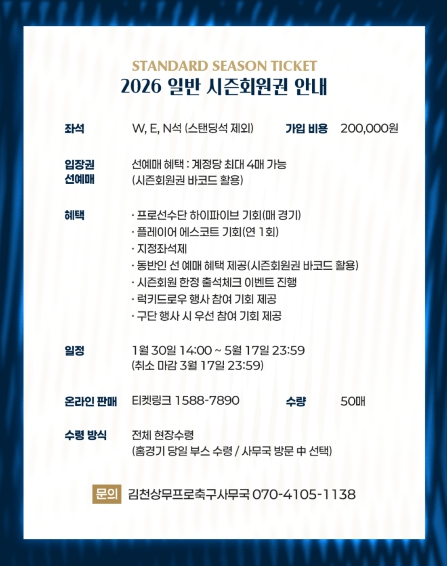 김천상무프로축구단(대표이사 이재하)이 1월 30일 14시부터 시즌회원, 어린이 시즌회원, 티켓북 판매를 시작했다.