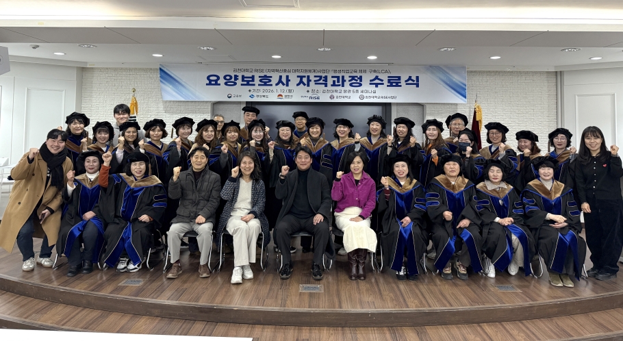 | 김천대학교(총장 윤옥현) RISE사업단은 지역 돌봄 및 장례 분야 전문 인력 양성을 위해 설립한 부설 요양보호사교육원과 장례지도사교육원의 제1기 교육과정을 성공적으로 마무리하고, 최근 수료식을 개최했다고 2월 2일 밝혔다.