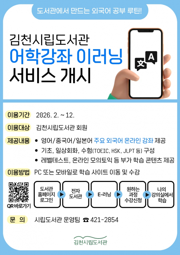 | 김천시립도서관(관장 이신기)은 시민에게 자기 주도적 외국어 학습 기회를 제공하기 위해 오는 2월부터 「외국어 e러닝」 온라인 강좌 서비스를 운영한다고 밝혔다.