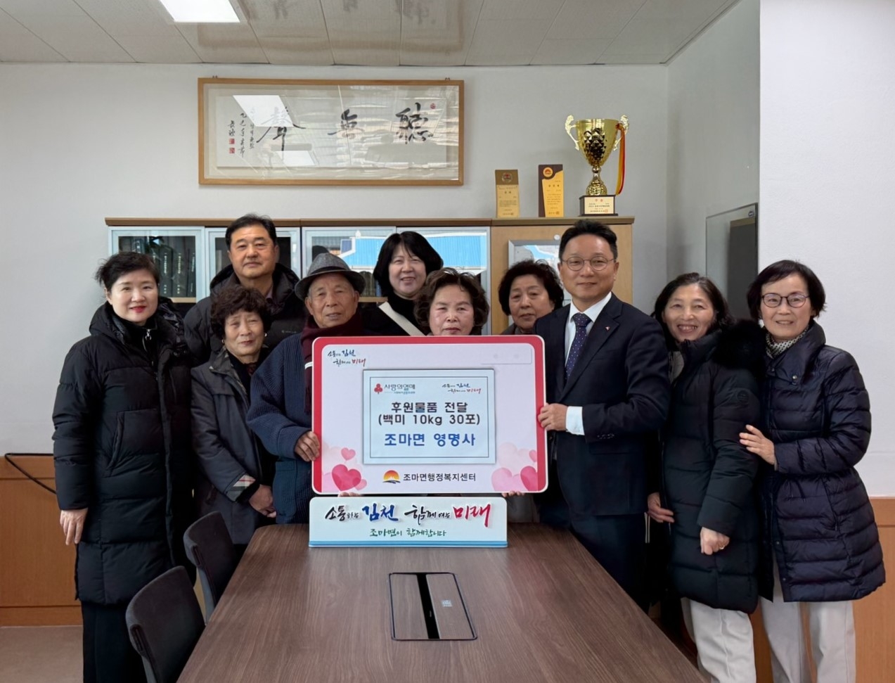 김영백 조마면장은 “관내 나눔 문화의 확산을 위해 노력해 주시는 영명사와 신도들에게 감사드린다.”라며, “기부해 주신 쌀은 조마면 내 복지 취약계층에 잘 전달하겠다.”라고 전했다.