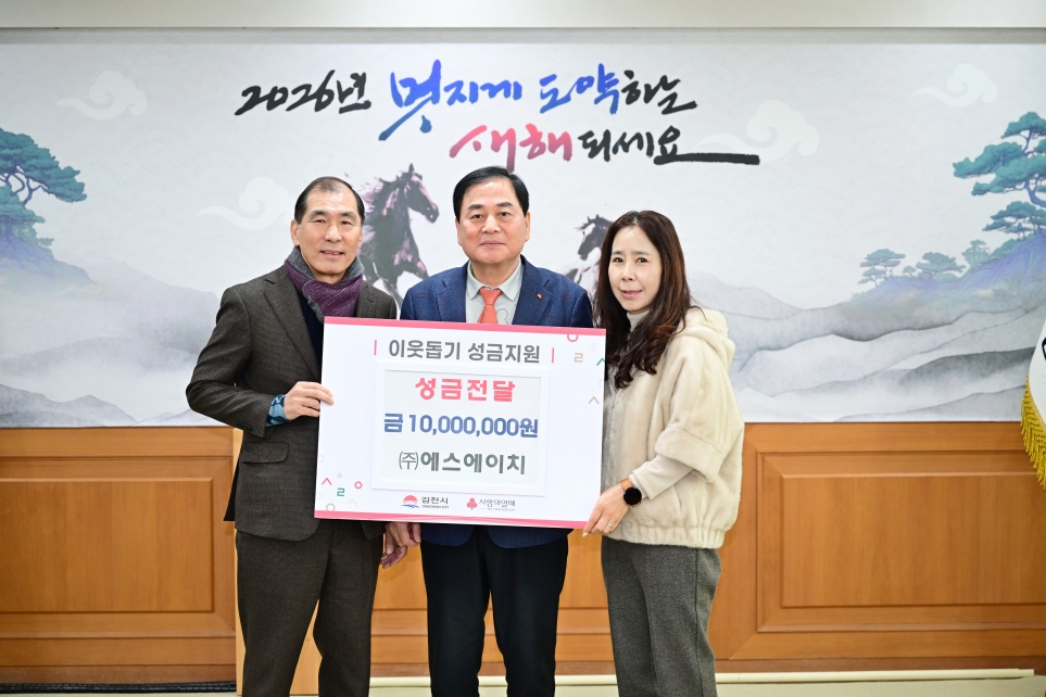 | 김천시(시장 배낙호)는 지난 2월 5일, ㈜에스에이치(대표 강미애)로부터 이웃돕기 성금 1,000만 원을 전달받았다고 밝혔다.