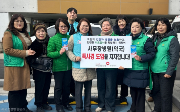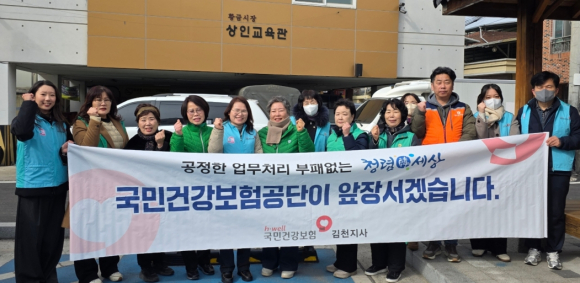 | 국민건강보험공단 김천지사(이하‘공단’)는 지난 2월 10일 김천시새마을부녀회 임원 등과 함께 관내 황금시장, 버스승강장 일원에서 ‘반부패·청렴실천 및 윤리경영’과‘사무장 병원(약국) 특사경’도입 지지를 선언하고 법안 통과를 촉구하는 캠페인을 펼쳤다.