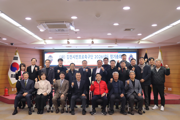 김천상무프로축구단이 2월 11일 오후 4시, 김천시청 2층 회의실에서 2026년도 정기총회를 개최했다. 행사에는 배낙호 구단주, 이재하 대표이사, 김천시체육회 최한동 회장, 여영각 후원회장을 비롯한 대의원과 이사들이 자리했다.