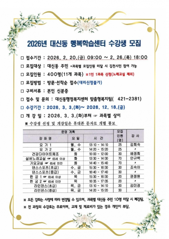 | 김천시 대신동(동장 이해정)은 2026년 대신동 행복학습센터 프로그램을 3월 3일 개강해 12월까지 운영한다고 밝혔다.
