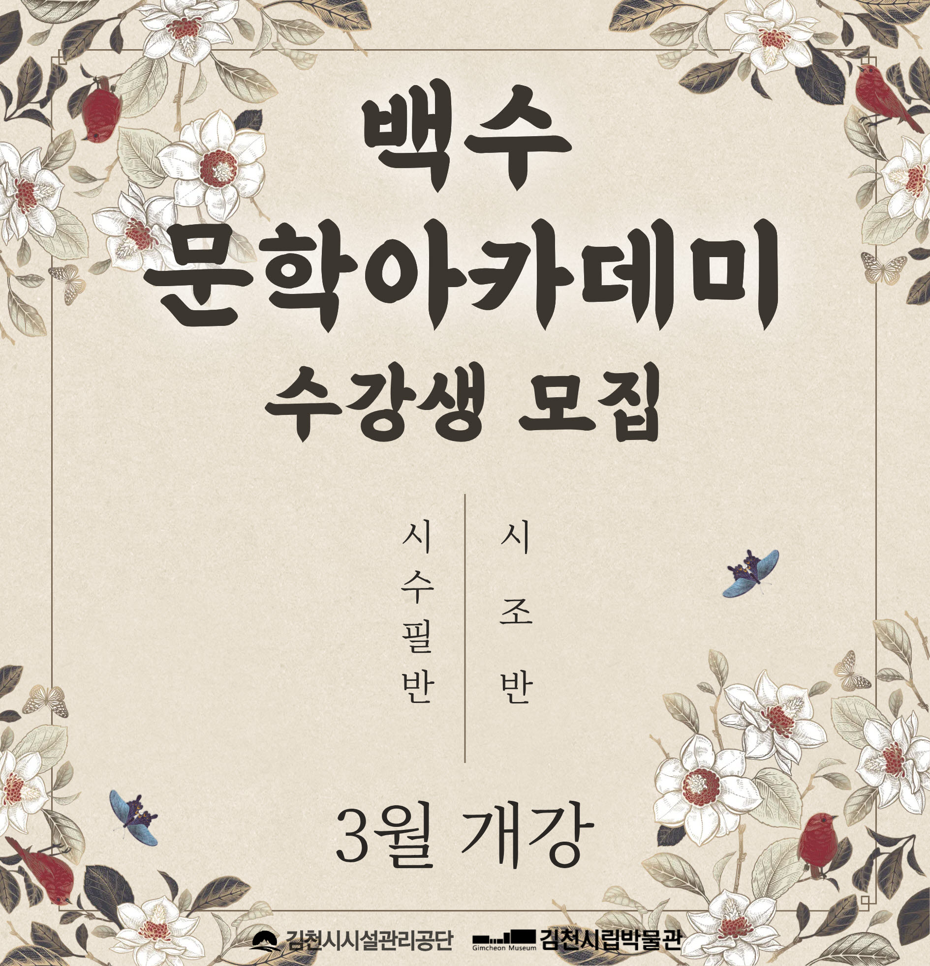 | 김천시시설관리공단(이사장 김재광)은 오는 3월부터 백수문학관과 김천시립박물관이 연계한 교육 프로그램 ‘백수문학아카데미’를 운영한다.