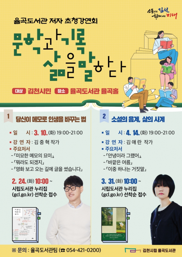 강연 신청은 2월 24일(화) 오전 10시부터 김천시립도서관 누리집(gcl.go.kr)을 통해 선착순으로 접수한다. 문의는 김천시립도서관 율곡도서관팀(☎421-0212)으로 하면 된다. |