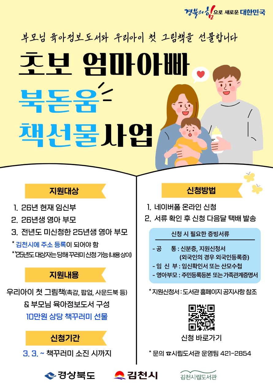 | 김천시립도서관(관장 이신기)은 예비 부모와 영아 가정을 응원하고, 생애 초기부터 책과 함께하는 양육 환경을 조성하기 위해 「초보 엄마아빠 북돋움 책선물 사업」을 추진한다.