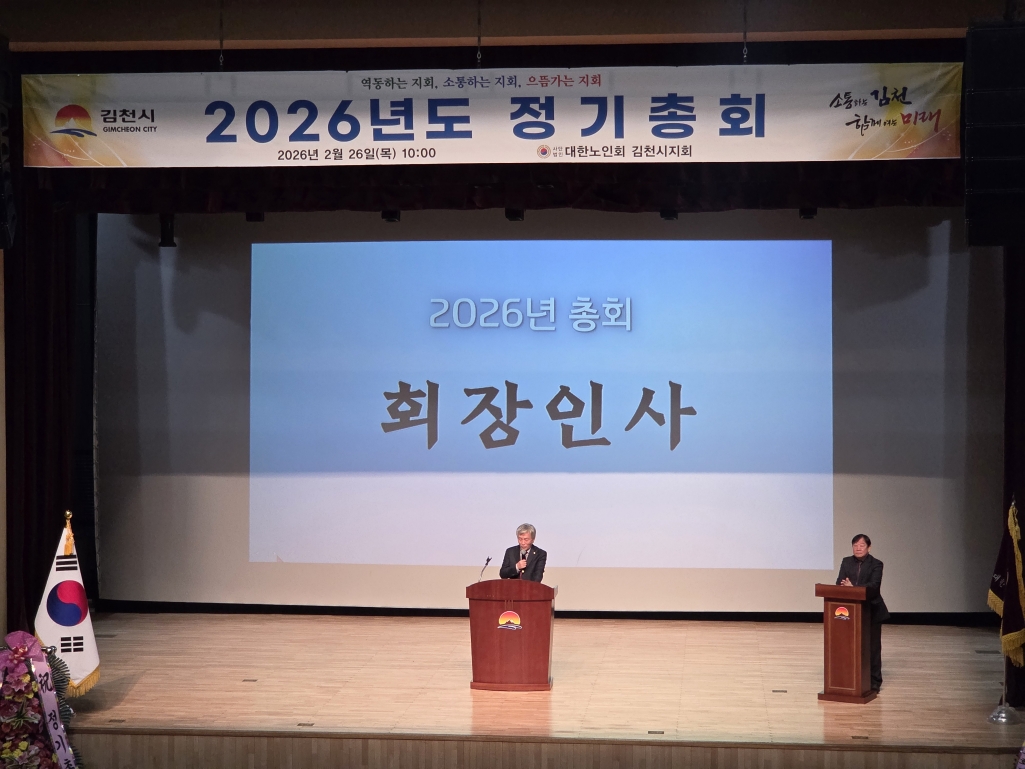 | 대한노인회 김천시지회는 2월 26일 김천문화회관 대공연장에서 경로당 회장 및 관계자 등 300여 명이 참석한 가운데 2026년 정기총회를 개최했다.
